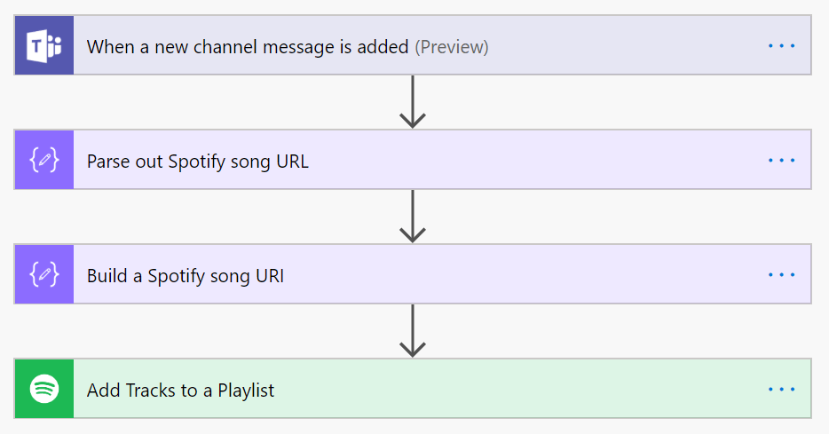 “When a new channel message is added” piece is our trigger. There’s nothing very exciting here, except that, this is where you specify the channel in Teams that should be monitored for new messages. This is the channel you’d ask your team to share the Spotify songs to. The interesting stuff follows this step.