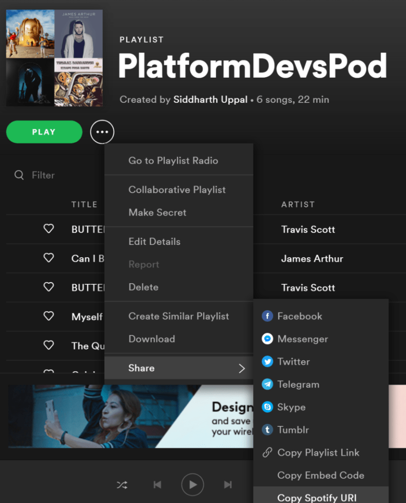 “Add Tracks to Playlist” is straight-forward as well once you’ve got the rest of the steps right. It receives the “spotify:track:<bla>” URI from the previous step, and needs to be given the ID of the Spotify Playlist to add the song to. You can grab that using the Spotify client via the … next to the playlist name as shown here.