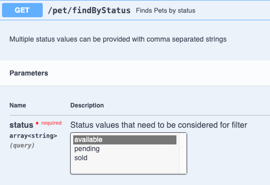 So, now in your app you’re building a drop-down to pick a status (available/pending/sold), pulling pets with that status, and writing client logic to find pets by name.