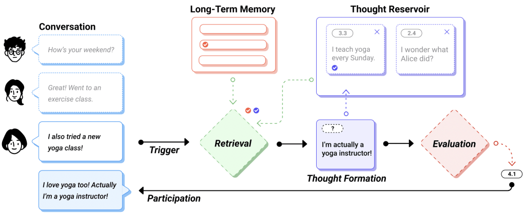 - Giving an agent a persona and having it run a continuous internal monologue leads to more natural participation in group conversations.